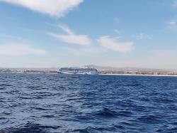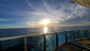 This trip Lou bid on a penthouse suite and won the bid! The suite was much bigger than a mini suite and had a very large balcony. This is the morning view from our balcony as we cruise the Mexican Riviera. |