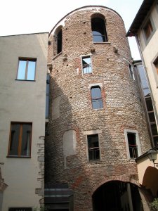 high, fortified walls and a giant tower. The Piazza also boasts a copy of
